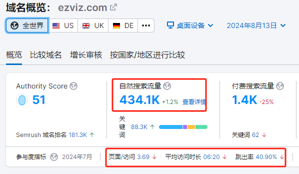 僅僅是7月份,品牌獨(dú)立站的自然搜索流量就達(dá)到了恐怖的434.1k,幾乎可以媲美國內(nèi)許多出海新秀品牌的獨(dú)立站半年的訪問量。