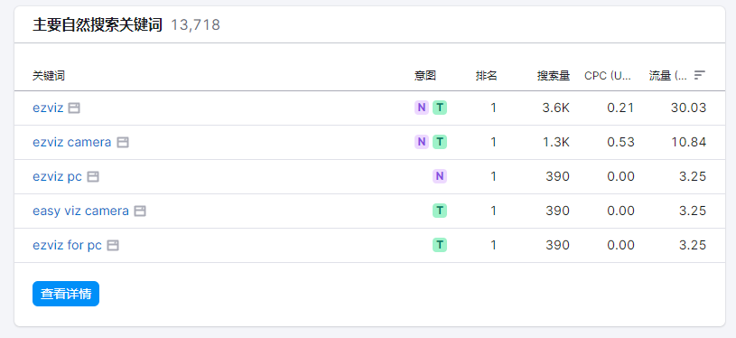 這說明,自然訪問螢石網(wǎng)絡(luò)品牌獨(dú)立站的流量是相當(dāng)精準(zhǔn)的。另外筆者注意到,其品牌獨(dú)立站ezviz.com主要自然搜索詞第三“ezviz pc”及第五“ezviz for pc”