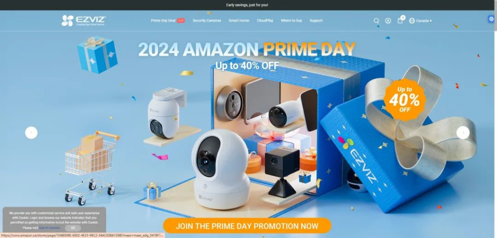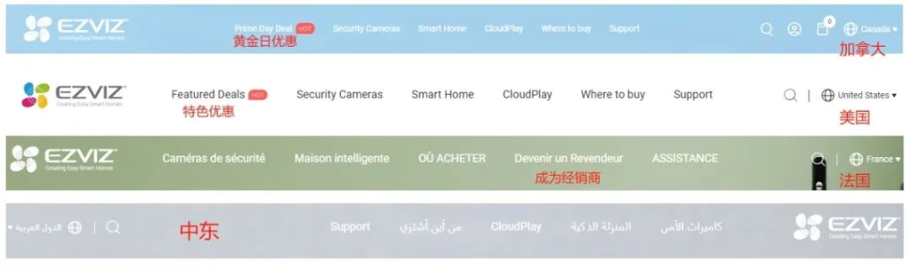 從左到右:美國、加拿大、日本、中東在網(wǎng)站運(yùn)營策略上,各個地區(qū)也是不同的,這點(diǎn)可以從ezviz.com各個國家獨(dú)立站看出來。首先是獨(dú)立站首頁欄目設(shè)置不同,在美國、加拿大等北美國家左一欄目都為促銷信息;